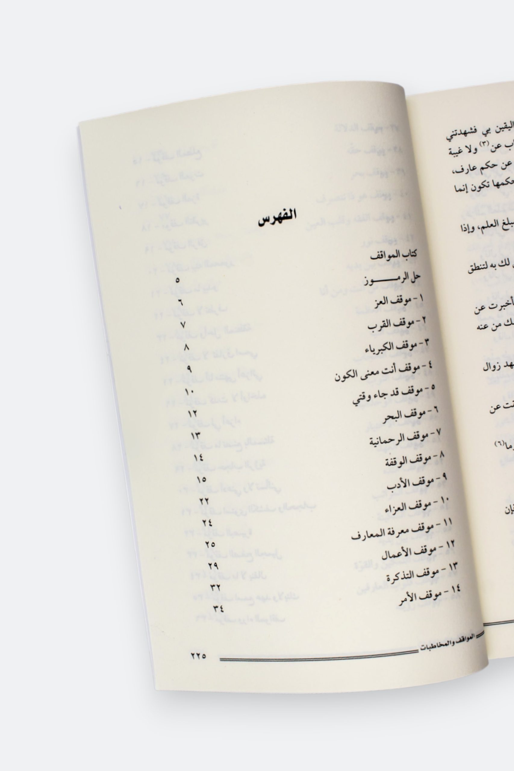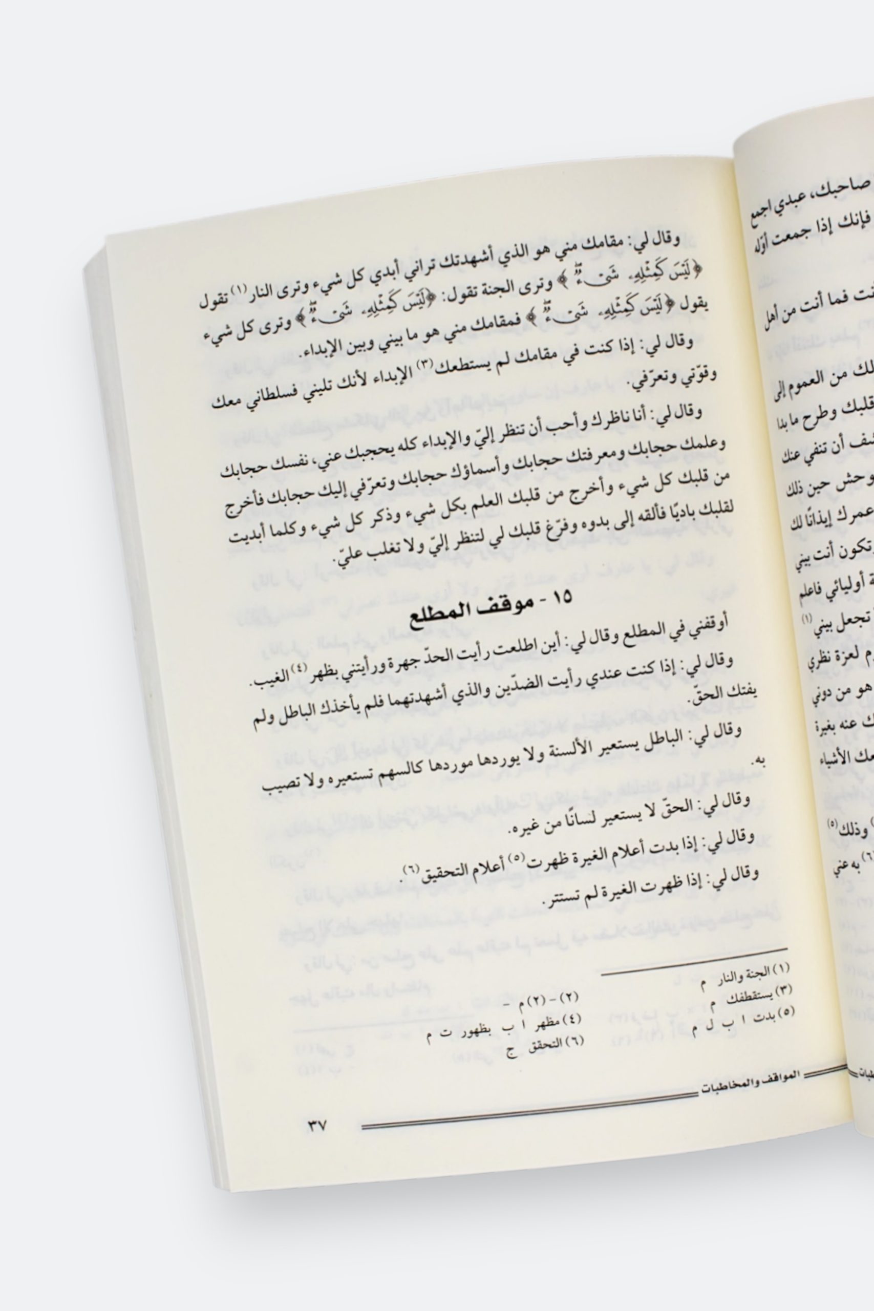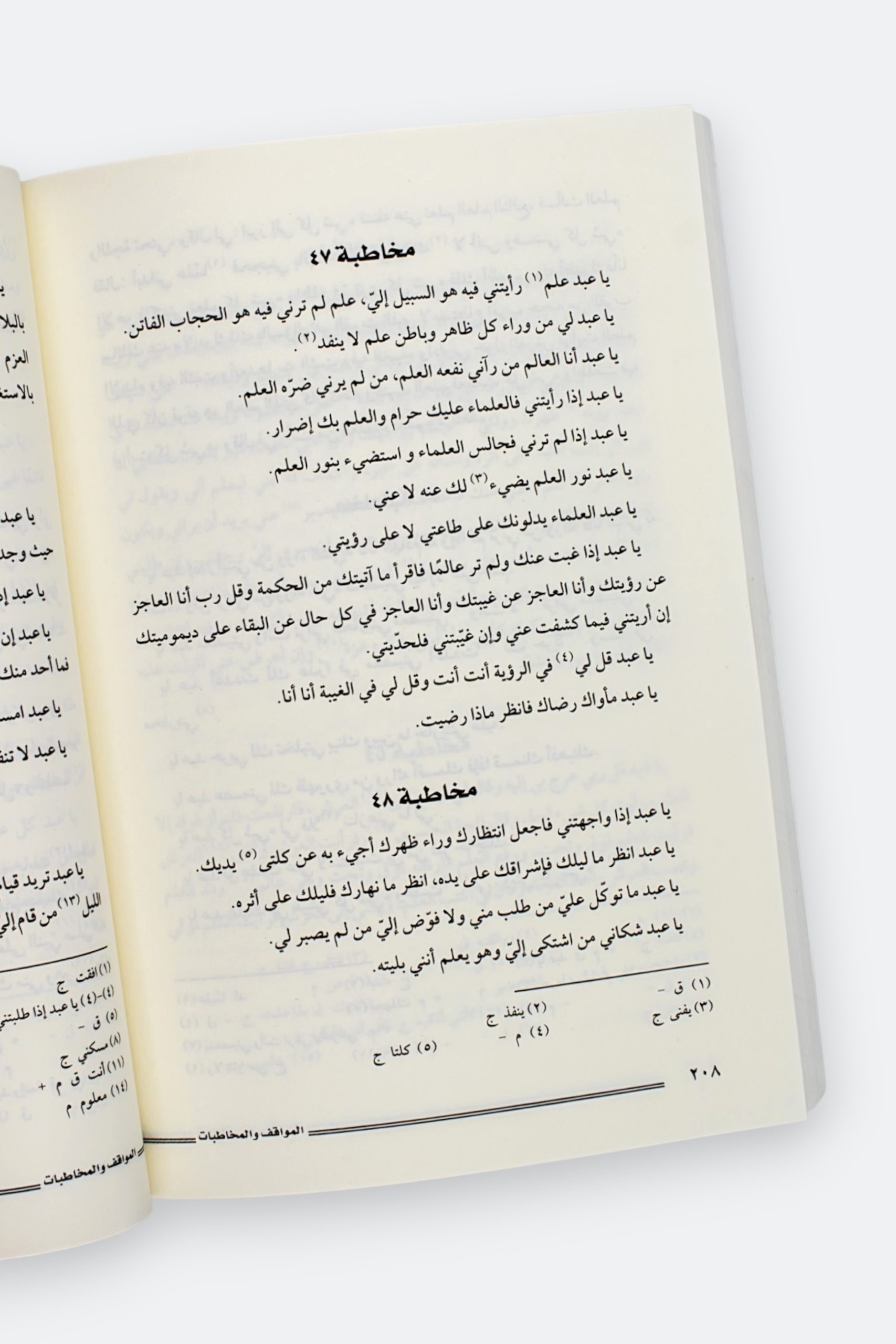 كتاب في التصوف والادب مع الله عز وجل، وهو كتاب عظيم في نفعه غريب في اسلوبه حيث يذكر الكاتب موقف الشرع والدين من كل امر وقف عليه ثم يذكر لسان حاله وكأن الشاعر يخاطبه فيقول : ” وقفني في كذا وقال كذا ” وكذلك في المخاطبات، فجاء الكتاب رائع الاسلوب، سهل التحصيل، عظيم النفع.