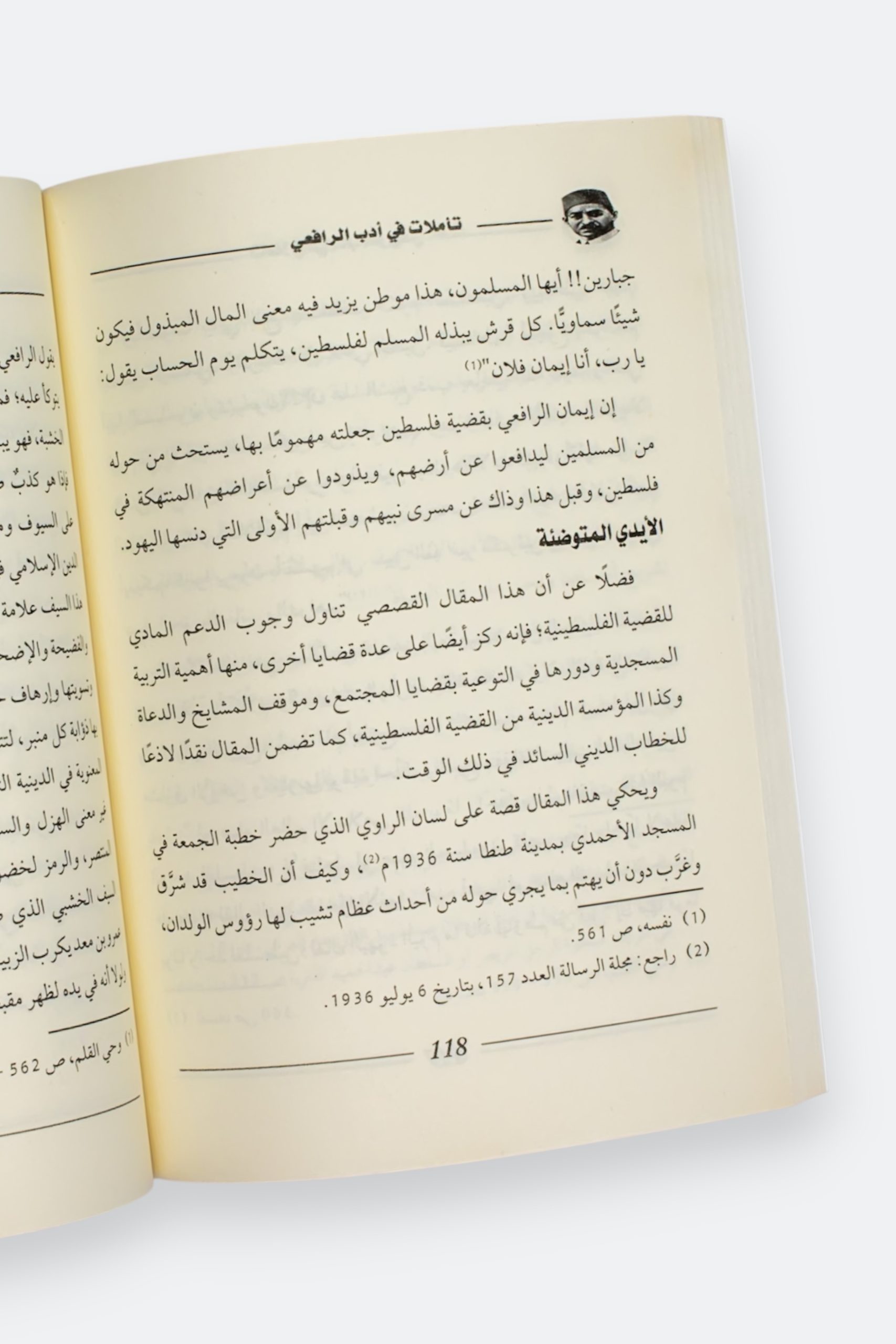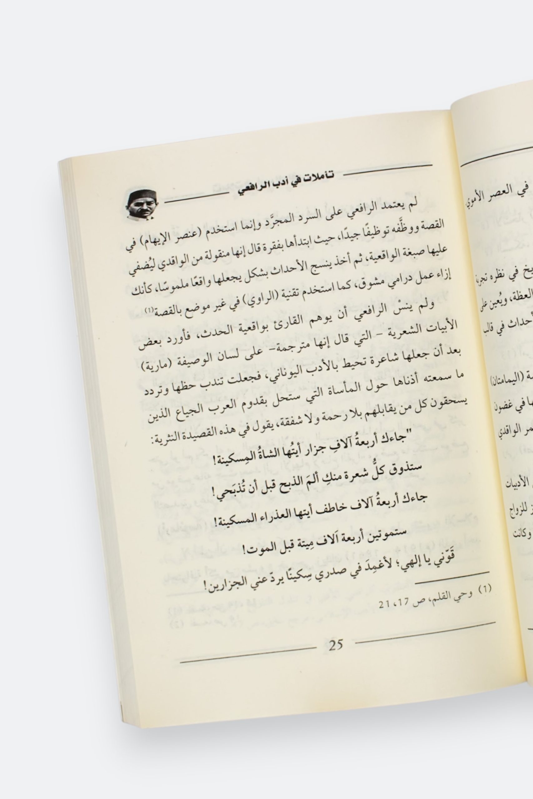 يدور هذا الكتاب حول منجز أديب العربية مصطفى صادق الرافعي (1880 – 1937م = 1298 – 1356 هـ) حيث يرصد جوانب متعددة من فكر الرجل وحياته، كما يستجلي موقفه من بعض القضايا الأدبية والاجتماعية والسياسية وتناوله لها ومعالجته إياها فكثير من الأدباء يعيش حياته للأدب والقلم بمنأى عن التفاعلات المجتمعية التي تحيط به ويختار التحليق في عالم افتراضي غير مكترس بما يموج حوله من أحداث جسام.