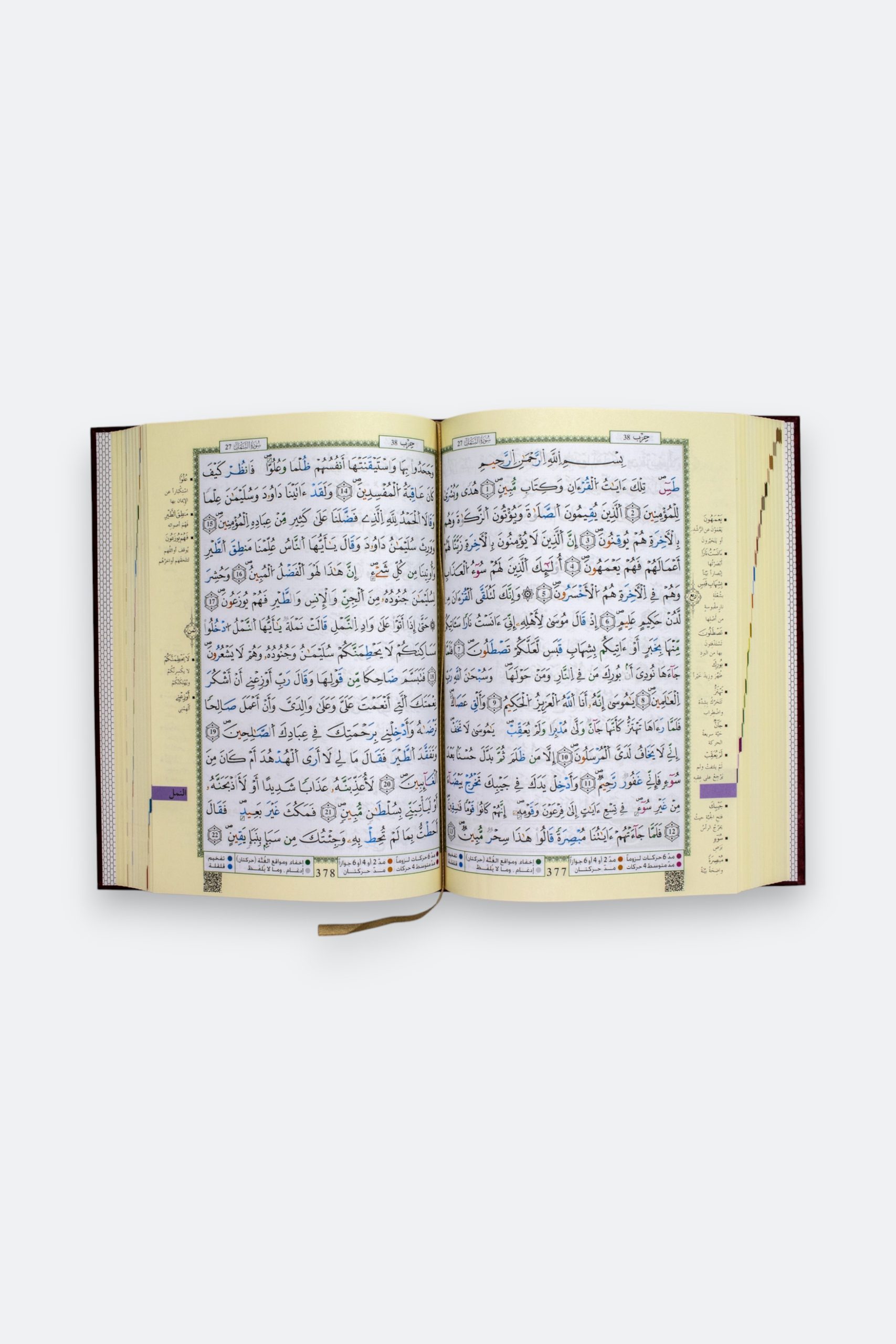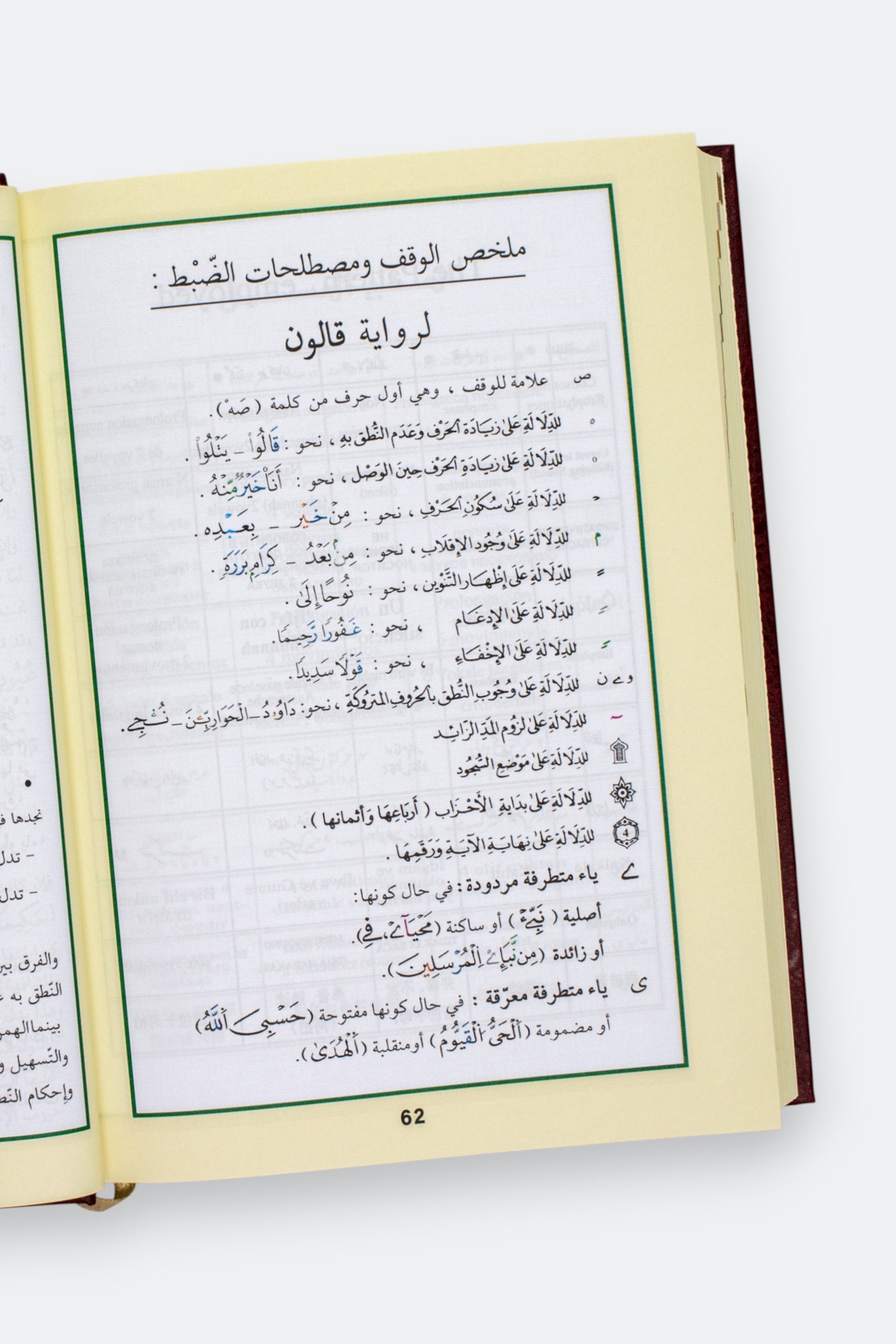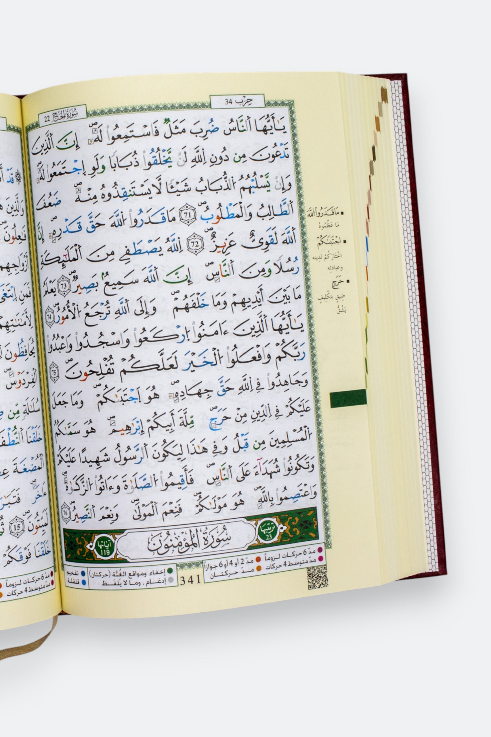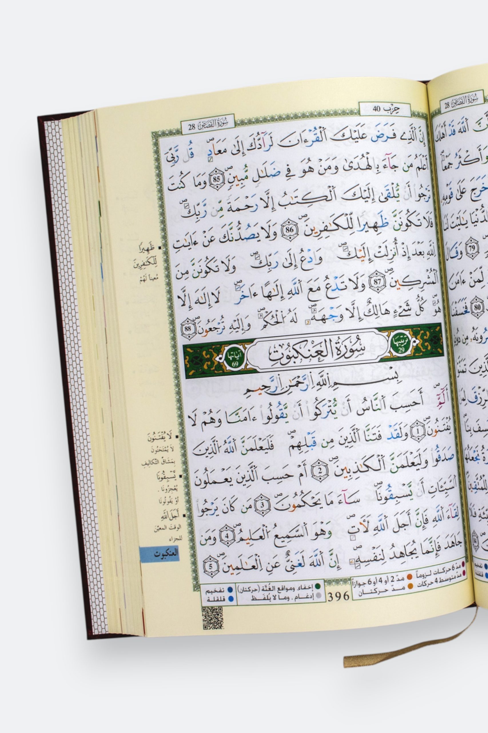 2. تلوين أحكام التجويد: يتميز المصحف باستخدام الألوان لتوضيح أحكام التجويد، مثل المدود، الغنة، والإدغام، مما يُسهل على القارئ تطبيق القواعد التجويدية أثناء التلاوة.